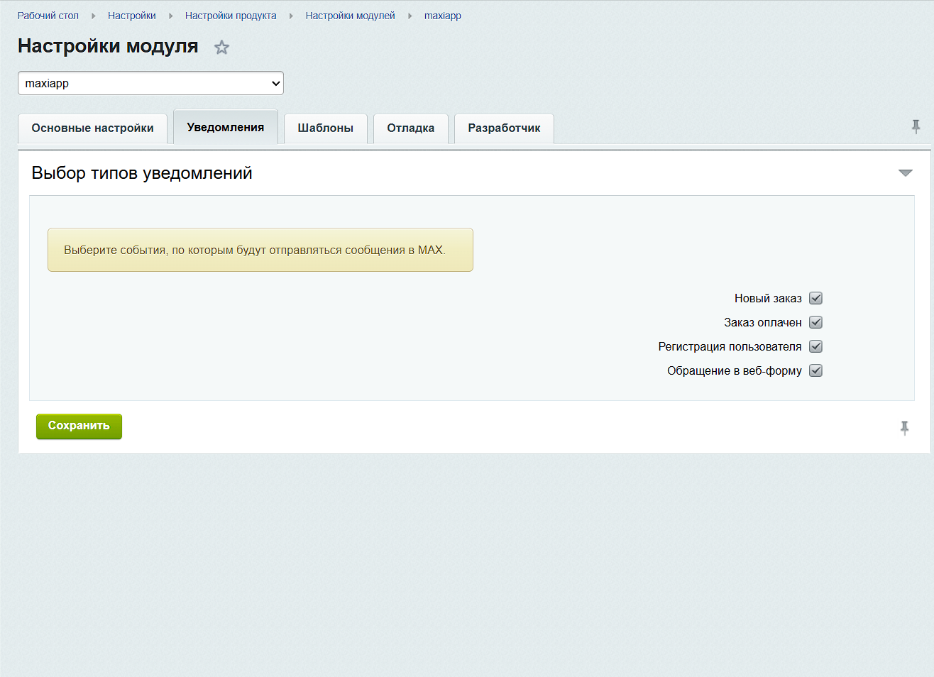 - Мгновенная отправка информации о новых заказах в мессенджер