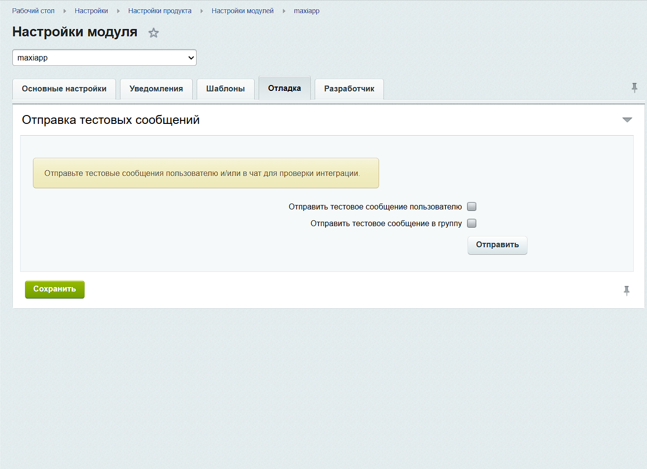 - Настройка получателей: отдельный пользователь, рабочий чат