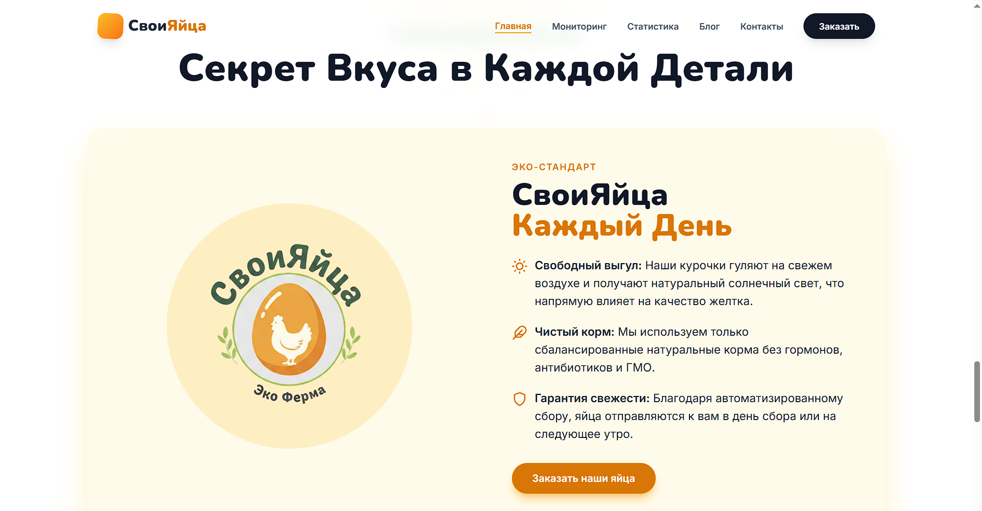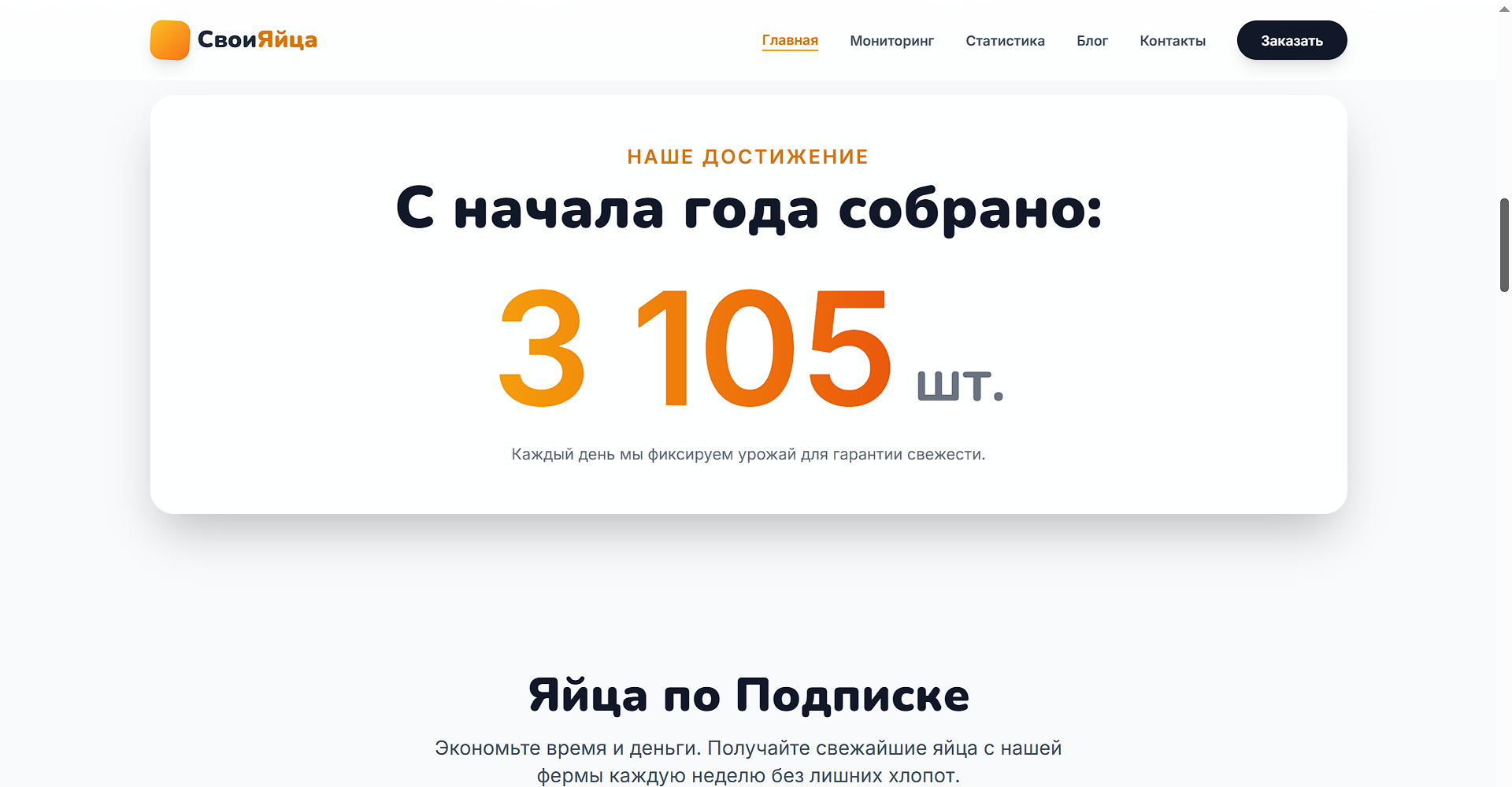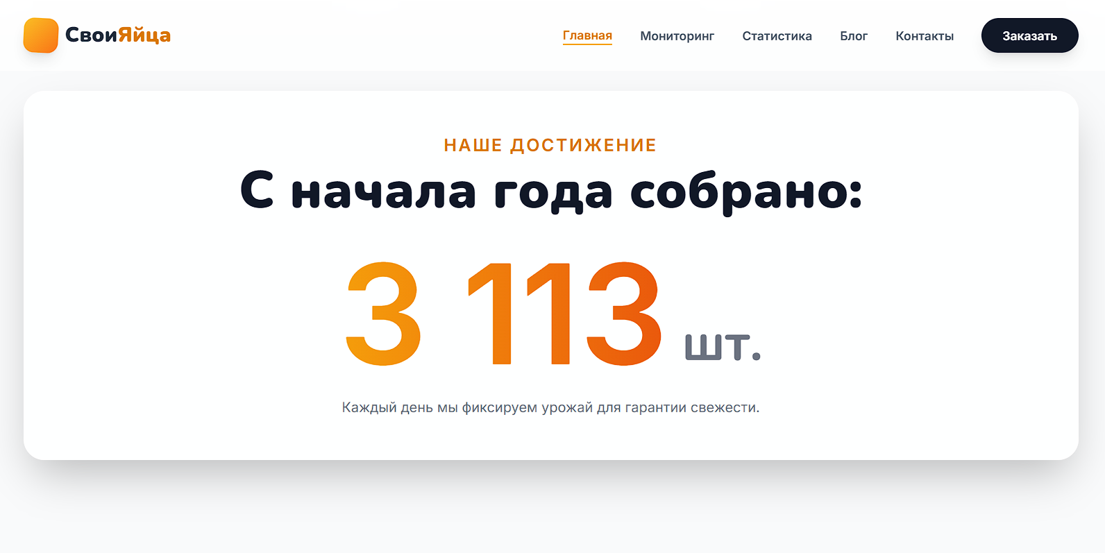 Статистика производства: Помимо текущих условий, сайт отображает статистику произведенных яиц. Это дает полную картину продуктивности и честно информирует о реальном объеме доступного для покупки товара.