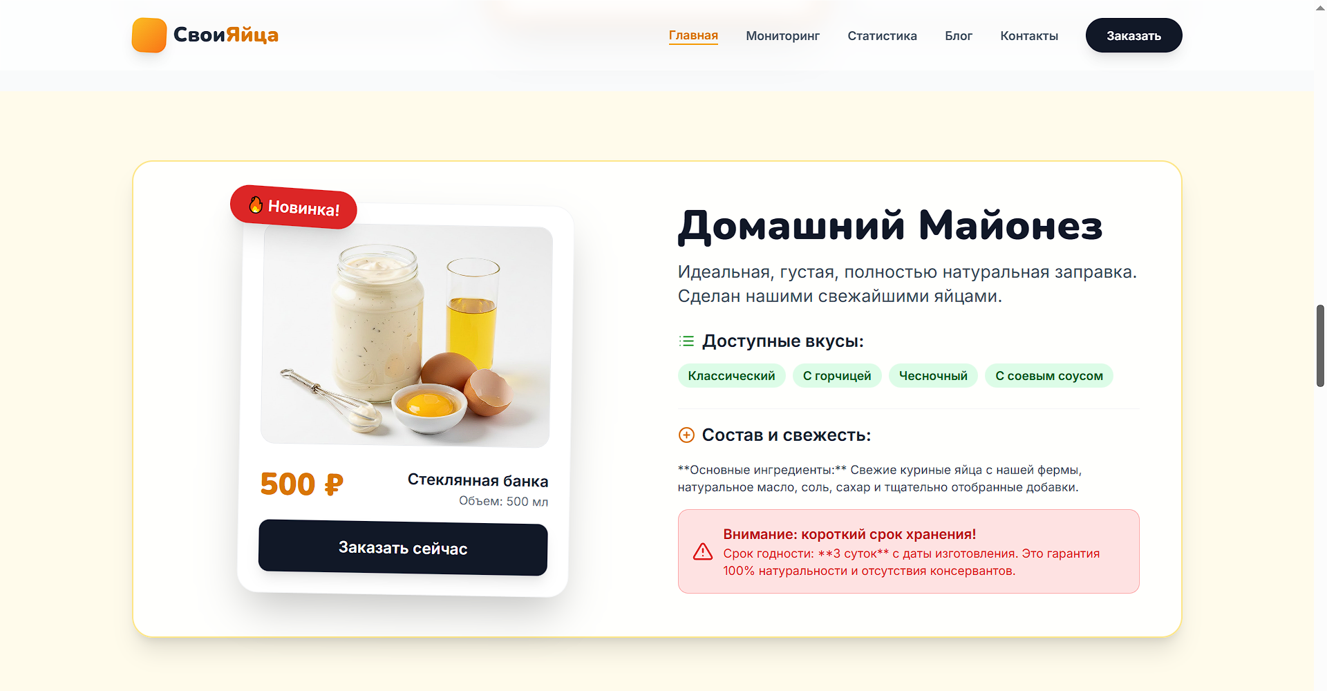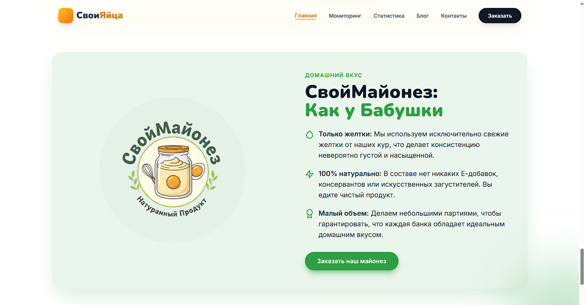 Вместе с запуском сайта ферма представила и свою новинку — "СвойМайонез". Это натуральный продукт, созданный прямо на ферме, где главным ингредиентом являются, конечно же, свежайшие яйца от счастливых несушек. Это не просто майонез, это прямое доказательство качества основного сырья.